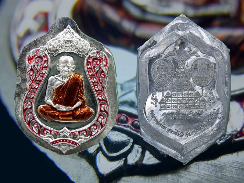 1.3 ทองแดงกะไหล่เงิน กนกน้ำเงิน พื้นแดงจีวรมี 5 องค์ๆละ 320 บาท