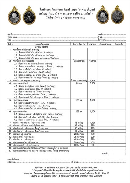 รายการที่ 6 กรรมการชุดเล็ก จำนวน 1 ชุด รับพระ 3 เหรียญ ราคาชุดละ 1200 บาท