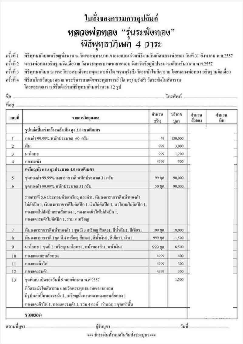 ขายใบจอง ใบที่1 รายการที่ 13 ชุดกรรมการ (มี 4 องค์ - รูปหล่อปั๊มทองระฆัง 1, เหรียญนั่งพานทองแดงกะหลั่ยทอง 1, ทองแดงผิวไฟ 1, ทองแดงรมดำ 1 ) มี 4 ชุด ชุดละ 1,900 บาท
