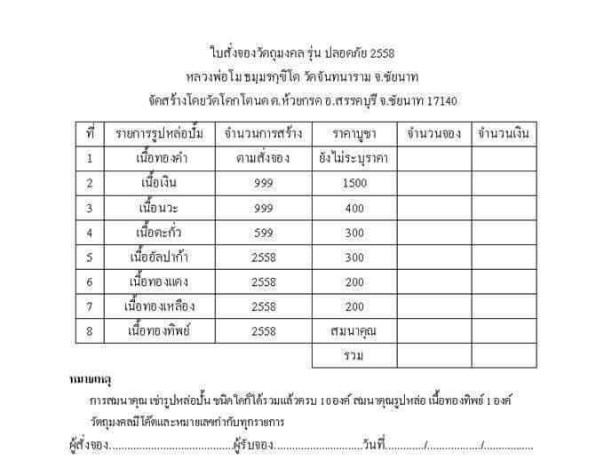 ...... สายเหนียว เมตตา ค้าขาย ไม่ควรพลาดรุ่นนี้นะครับ.......ลูกศิษย์และผู้ที่เคารพศรัทธาต่างรอคอยกันมานานที่จะได้ครอบครองวัตถุมงคลของหลวงพ่อโมรุ่นนี้ ที่ได้นำมวลสารศักดิ์มากมายมาบรรจุไว้ใต้ฐาน โดยเฉพาะ *** อัฐิหลวงพ่อโมที่หาได้ยากยิ่ง หลวงพ่อทองเจ้าอาวาสองค์ปัจจุบันเมตตามอบให้ *** จึงทำให้ยอดเปิดจองหมดลงอย่างรวดเร็วครับ ตอนนี้เริ่มบวกกันแล้วนะครับพี่น้อง