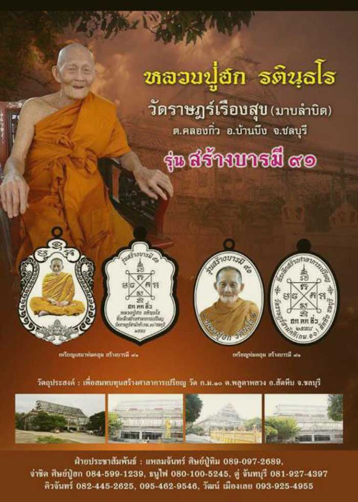 เปิดจอง เหรียญเสมาห่มคลุมและเหรียญรูปใข่ห่มคลุม รุ่นสร้างบารมี๙๑ หลวงปู่ฮก รตินุธโร วัดราษฎร์เรืองสุข ซึ่งได้รับความเมตตาจากหลวงปู่เพื่อหารายได้สมทบทุนสร้างศาลาการเปรียญ วัดกิโล10 อ.พลูตาหลวง อ.สัตหีบ จ.ชลบุรี