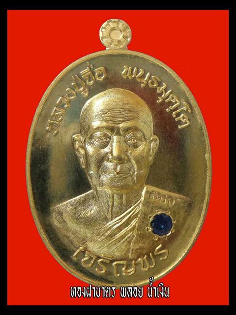 6.2 ทองฝาบาตร ฝังพลอยแท้ ๙ รอบ ไม่ตัดปีก หลังยันต์ (น้ำเงิน ,เหลือง ,ขาว ,เขียว ,แดง ,ม่วง สีละ 35 เหรียญ) เหรียญละ 800 บาท มียอด 1 เหรียญ