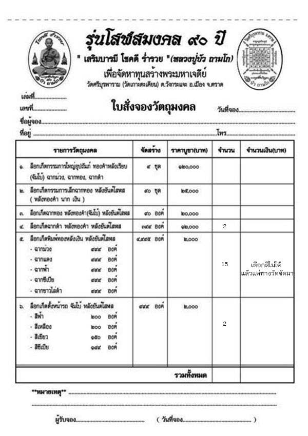 โอนเงินเพื่อสั่งจองบูชา ภายใน 1 วัน หลังจากปิดจอง ได้ที่