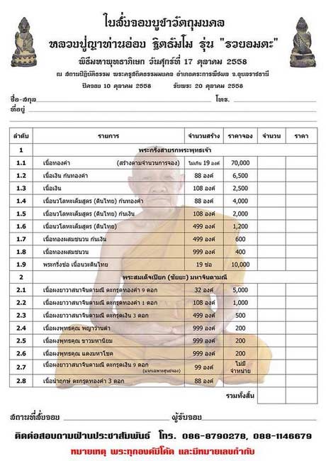 โอนเงินภายใน 2 วัน นับจากวันที่จอง ค่าจัดส่ง ems 100 บาท/บิลวัตถุมงคลมีจำนวนน้อยความสอบถามข้อมูลก่อนสั่งจอง