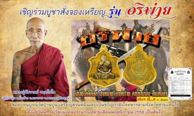 เปิดจอง หลวงปู่ชัชวาลย์ จนฺทโชโต วัดบ้านปูน จ.พระนครศรีอยุธยา"" รุ่น อริพ่าย "" รับวัตถุมงคล วันที่ 30 พฤศจิกายน 58 เป็นต้นไป มีโค๊ตและหมายเลขกำกับทุกองค์ สนใจสอบถามได้ครับ++++++++++++++++++++++++