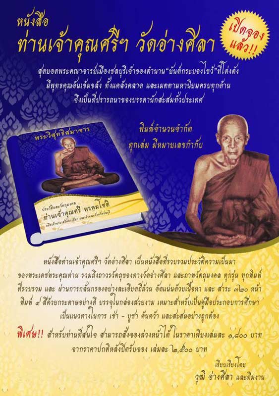 เปิดจอง หนังสือท่านเจ้าคุณศรี วัดอ่างศิลา จัดทำโดย วุฒิอ่างศิลา จัดทำจำนวนจำกัดเพียง 1000 เล่ม ทุกเล่มรันนัมเบอร์ รายละเอียดหนังสือรับประกันครบทุกรุ่น ทุกพิมพ์อย่างละเอียดที่สุด ทุกรายละเอียดแต่ละรุ่นวิธีแยกพิมพ์แยกยุค รับประกันคุณภาพ