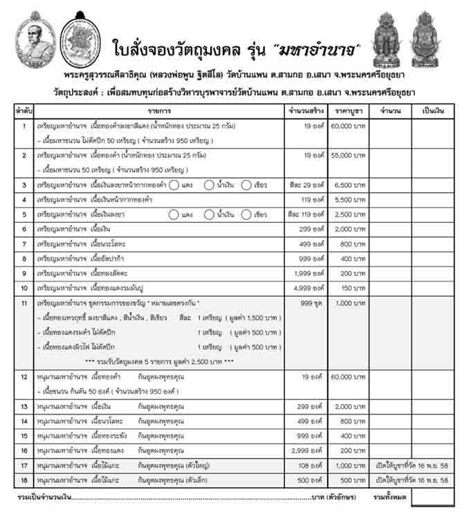 เปิดจอง หลวงพ่อพูน รุ่นมหาอำนาจ วัดบ้านแพน ต.สามกอ อ.เสนา จ.พระนครศรีอยุธยา