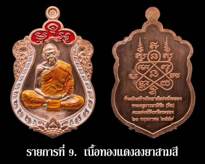 เปิดจองราคาบวก รายการ 9 เนื้อทองแดงลงยา 3 สี มียอด 50 เหรียญ ๆ ละ 350 บาท (ค่าจัดส่งบิลละ 100 บาท)
