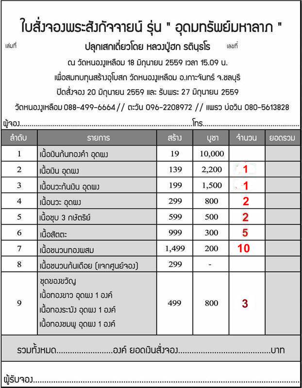 จองพระสังกัจจายน์ รุ่น อุดมทรัพย์มหาลาภ เสกเดี่ยวโดยหลวงปู่ฮก รตินธโร ณ.วัดหนองงูเหลือม วันที่ 18 มิ.ย.59 เวลา 15.09 น.