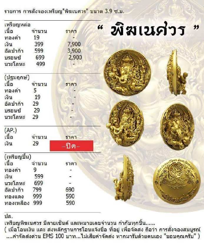 แบ่งจองพระพิฆเนศวร งานพุทธศิลป์ ผลงานของศิลปิน วีรยุทธ สร้าง ขนาดเส้นผ่าศูนย์กลางประมาณ 3.9 ซม.