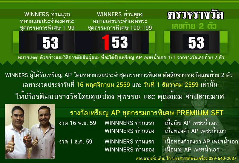 WINNERS ผู้ได้รับเหรียญ AP โดยหมายเลขประจำชุด ตัดสินจากรางวัลเลขท้าย 2 ตัว