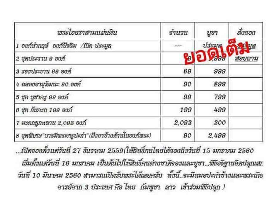 ตั้งแต่วันที่ 16 มกราคม เป็นต้นไปให้สิทธิ์คนต่างชาติจองและบูชา....พิธีอธิฐานจิตปลุกเสกวันที่ 10 มีนาคม 2560 สามารถเปิดรับพระได้เลยครับ...ทั้งนี้..จะมีหมอปะกำช้างและพระเกิอาจารย์จาก 3 ประเทศ คือ ไทย กัมพูชา ลาว เข้าร่วมพิธีปลุก )