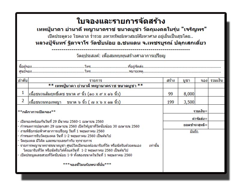 เปิดให้จองราคาวัด บวกค่าธรรมเนีบมการจัดส่ง EMS
