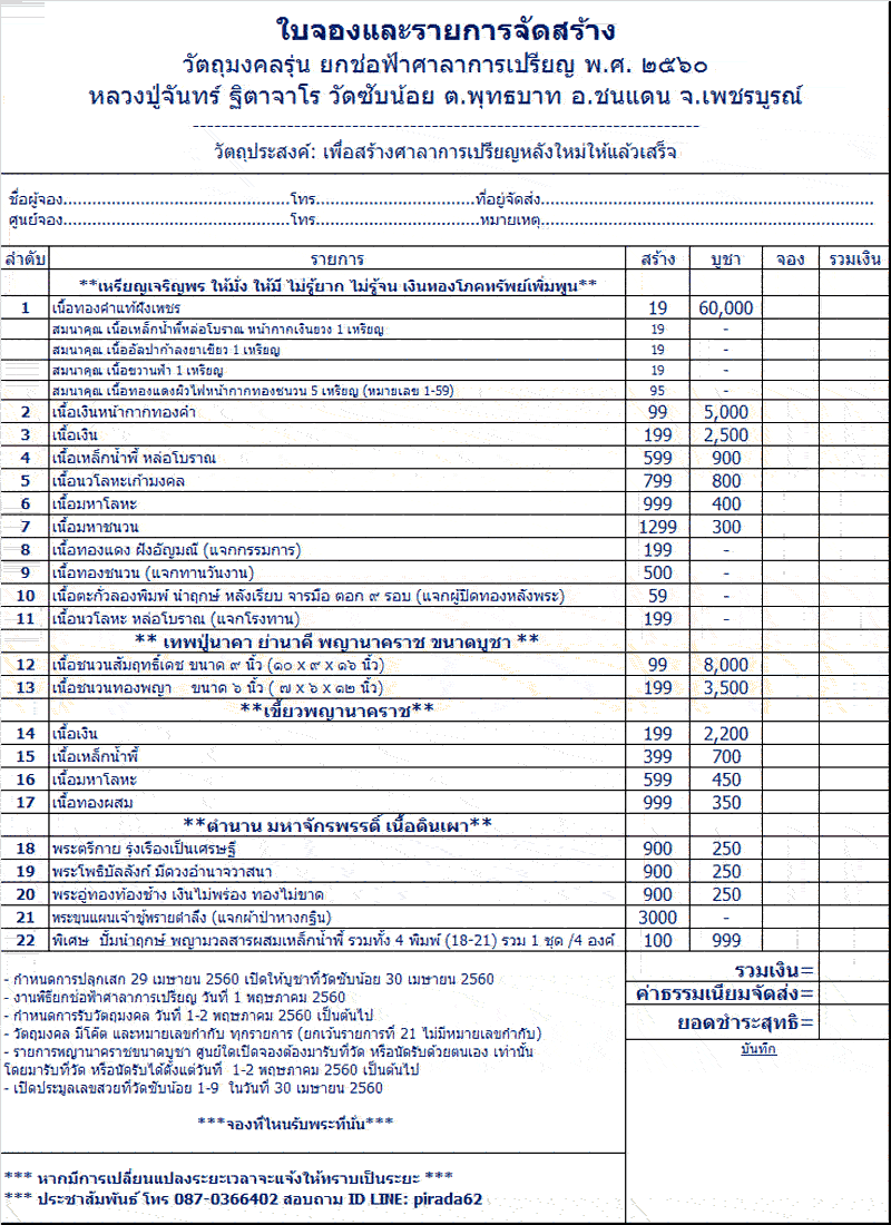 - รายการที่ 18+19+20 อย่างละ 1 องค์ (พระตรีกาย+พระโพธิบัลลังก์+พระอู่ทองท้องช้าง) มี 2 ชุดๆละ 950 บาท