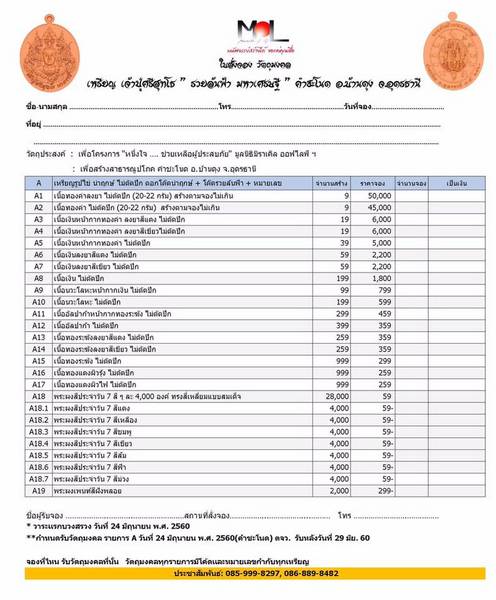 **กำหนดรับวัตถุมงคล รายการ A วันที่ 24-29 มิถุนายน พ.ศ. 2560 |