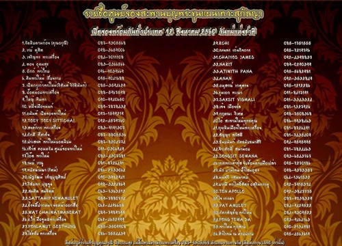ใบรายการรายชื่อเนื้อครบทุกเนื้อของขุนแผนเทวะสุกัลญา ลุ้นทุกเนื้อลุ้นทุกรายการลุ้นตะกรุดทองคำ คับทุกรายการมีทีเด็ดแน่นอนคับ ติดตามกับสะพานบุญที่ 40 โอ๋ สะพานใหม่ พระเครื่องพุทธคุณ เปิดจองอย่างเป็นทางการ 12 สิงหาคม 2560 พร้อมกันทั่วประเทศคับ |