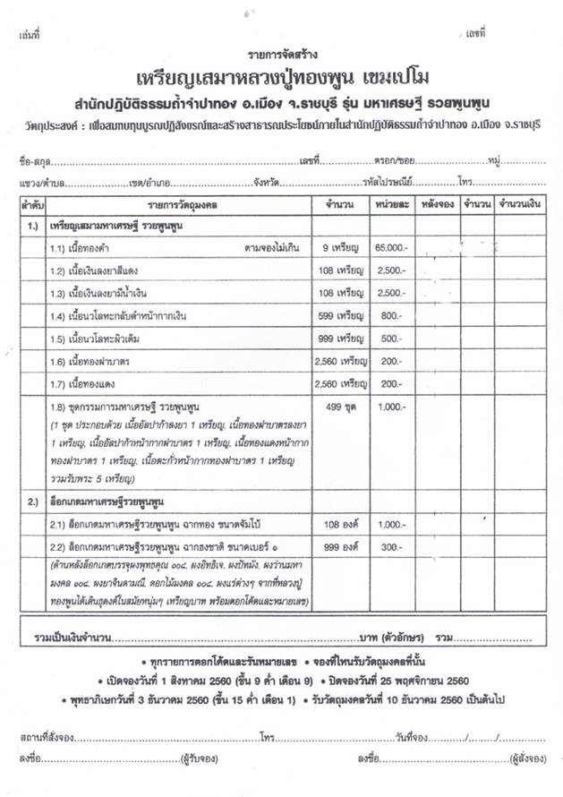 เพื่อสมทบทุนบูรณปฏิสังขรณ์ และสร้างสาธารณประโยชน์ภายในสำนักปฏิบัติธรรมถ้ำจำปาทอง อ.เมือง จ.ราชบุรี