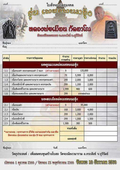 วัตถุประสงค์ เพื่อสมทบทุนสร้างโบสถ วัดจะเนียงวนาราม อ.กระสังข์ จ.บุรีรัมย์