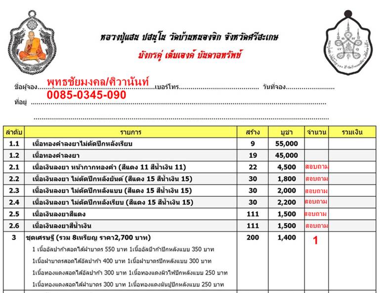เปิดให้จองตามรายการ ราคาวัดค่ะ