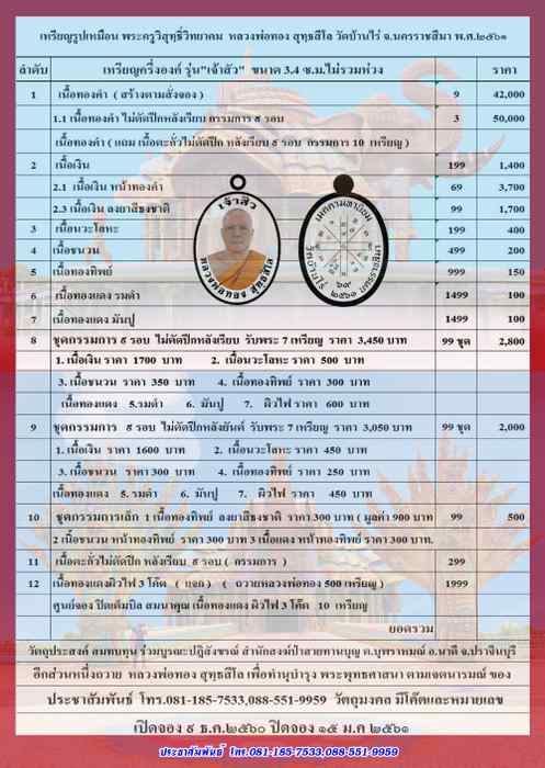 1. เนื้อเงิน ราคา 1600 บาท 2. เนื้อนวะโลหะ ราคา 450 บาท