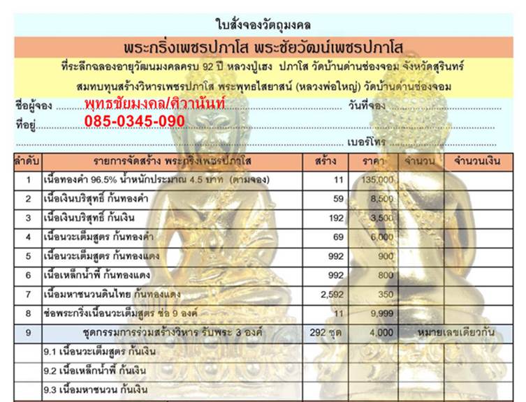 รายการที่เปิดจอง ราคาวัด