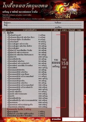 ...เปิดจองรายการลุ้นโชคราคาจองเพียง 150 บาทมีลุ้นถึงเนื้อเงินหน้าทองคำมียอดมาแบ่ง20 องค์ครับส่วนรายการอื่นๆสอบถามครับมีค่าส่ง ไม่เกิน3 องค์ 60 บาท ไม่เกิน 5องค์ 80 บาทเกิน 5องค์ 100 บาทครับ