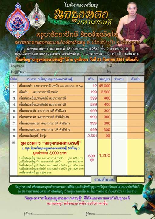 เปิดสั่งจองเหรียญนกยูงทองมหาเศรษฐี ครูบาชัยยาปัถพี สถานธรรมดอยดวงแก้วสัพพัณญู อ.เวียงป่าเป้า จ.เชียงราย วัตถุประสงค์ เพื่อสมทบทุนสร้างพระมหาเจดีย์ดวงแก้วสัพพัณญูสะหรีปุตตอริยถะเมตไต ณ.สถานธรรมดอยดวงแก้วสัพพัณญู บ้านทุ่งม่านเหนือ อ.เวียงกาหลง อ.เวียงป่าเป้า จ.เชียงราย