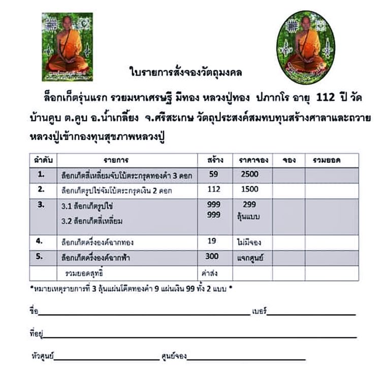 *** เปิดจอง//ล็อกเก็ต รุ่นแรก"รวยมหาเศรษฐี มีทอง" หลวงปู่ทอง ปภากโร อายุ 112 ปี วัดบ้านคูบ อ.น้ำเกลี้ยง จ.ศรีสะเกษ