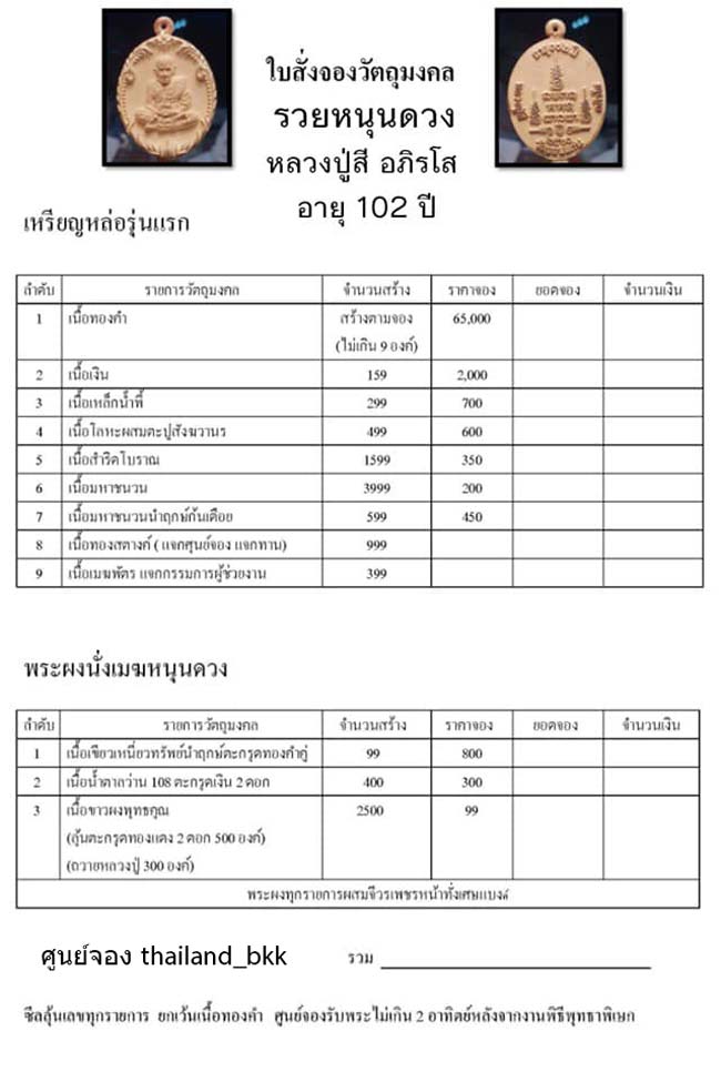 เนื้อมหาชนวนนำฤกษ์ก้นเดือย ราคาจอง 450 บาท มียอด 10 เหรียญ