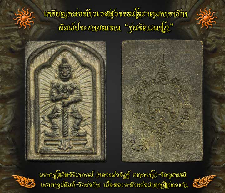 - รูปแบบสวยงาม ท้าวเวสสุวรณโณจตุมหาราชิกาพิมพ์ประภามณฑล ขนาดเหรียญกระทัดรัด ขนาดประมาณ 12*18 มม.