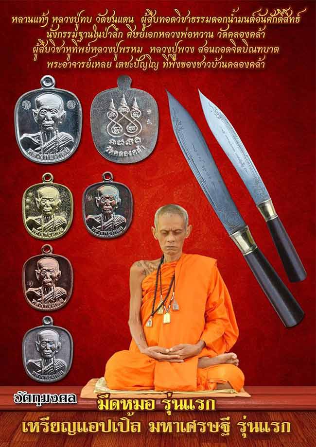 เหรียญปั้มพระอธิการเหลย รุ่นแรก ท่านสร้างเอง ก่อนสร้างนึกวันเก่าๆ ที่หลวงปูู่ทบ ปู่ของท่าน เรียกเข้าไปหา แล้วยื่นเหรียญปั้มพิมพ์แอปเปิ้ลให้ ปู่ทบท่านบอกว่า ข้าเสกทางมหาลาภออกหน้า มีเงินเข้าทุกวัน ยันด้วยมหาอุตมดันหลัง ไปไหนก็พาแคล้วคลาด เอ็งดูให้ดีว่าข้าเสกแบบไหน แล้วจำไว้ให้ดีล่ะ พระอาจารย์เหลยจำได้ดีวิชานี้ จนวันนี้นอนๆ อยู่ฝันเห็นปู่ทบ ท่านบอกจำเหรียญที่กูให้ได้ไหม ท่านก็ว่า จะได้สร้างบารมีด้วยเหรียญนี้ เสกตามที่ข้าสอน ของๆกูไม่มีของแล้ว ญาติโยมเขาจะได้พึ่ง รุ่งเช้าพอดี พระอาจารย์เหลย ท่านก็ร่างแบบ เขียนยันต์ เรียกมัคทายก มาจัดการสร้างเหรียญแอปเปิ้ลมหาเศรษฐี และมีดหมอ รุ่นแรก (เทพศาสตราแห่งโชคลาภ)