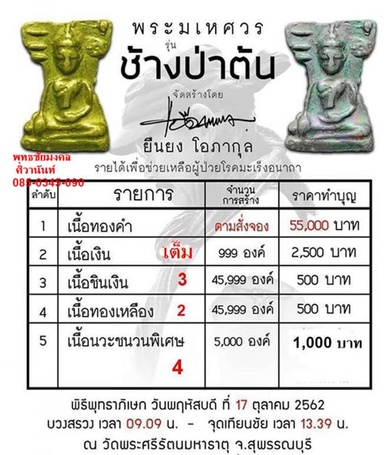 ....มีข่าวดีมาประกาศครับ เนื่องจากมีผู้อยากได้เนื้อเงิน 999 เป็นจำนวนมากที่จองเข้ามา แต่ว่ามันเต็มแล้ว คณะกรรมการจัดสร้างเลยตกลงจะเเบ่งเนื้อนวโลหะ จำนวน 2,000 องค์(จากที่จัดสร้างทั้งหมด5,000องค์เพื่อใช้แจกแขกผู้ใหญ่ที่มีอุปการะคุณ) เราขอจำหน่ายเพียงองค์ละ1,000 บาทเท่านั้นครับ และมีแค่2,000 องค์ จะมีรันนิ่งนัมเบอร์และตอกโค้ดเช่นเดียวกับเนื้อเงิน