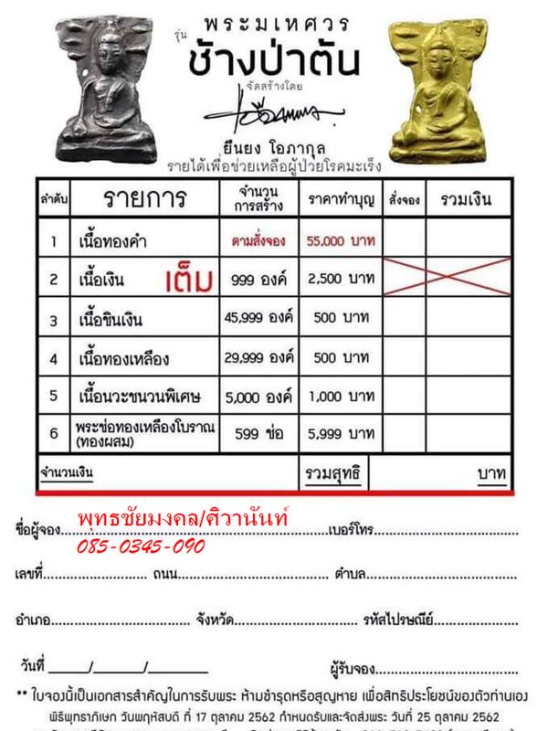 ....มีข่าวดีมาประกาศครับ เนื่องจากมีผู้อยากได้เนื้อเงิน 999 เป็นจำนวนมากที่จองเข้ามา แต่ว่ามันเต็มแล้ว คณะกรรมการจัดสร้างเลยตกลงจะเเบ่งเนื้อนวโลหะ จำนวน 2,000 องค์(จากที่จัดสร้างทั้งหมด5,000องค์เพื่อใช้แจกแขกผู้ใหญ่ที่มีอุปการะคุณ) เราขอจำหน่ายเพียงองค์ละ1,000 บาทเท่านั้นครับ และมีแค่2,000 องค์ จะมีรันนิ่งนัมเบอร์และตอกโค้ดเช่นเดียวกับเนื้อเงิน