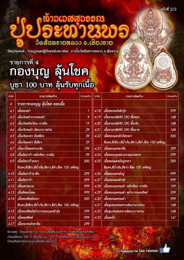 เปิดจอง...เหรียญท้าวเวสสุวรรณ รุ่นปู่ประทานพร วัดสันทรายหลวง จ.เชียงราย (รายการลุ้นเนื้อ 100 บาท)