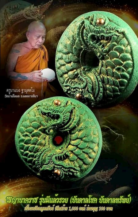 (บันดาลโชคบันดาลทรัพย์) ครูบาแบ่งท่านใส่ผงแป้งลูกสาวพญานาคราชที่ได้มาจากถ้ำโบราณเมื่อหลายสิบปีทีแล้ว และผงดูดทรัพย์ เรียกเงิน ผงนะมหาเสน่ห์ ผงเสกมนต์นาคราช ให้เอามาใส่ในรุ่นนี้และทำการปลุกเสกโดยใช้มนต์นาคราชสายวิชาลาวโบราณ โดยทำการปลุกเสกให้เป็นเครื่องรางแห่งนาคราช ที่นำออกมาเพื่อช่วยให้ลูกหลานสายพญานาคหรือคนที่นับถือองค์ท่านมีไว้บูชา ผู้ใดที่ได้ครอบครองชีวิตจะพบกับความร่ำรวย มีโชคมีลาภ มีเงินทอง มีรักแท้ที่ยั่งยืน หยิบหรือจับอะไรก็เป็นเงินเป็นทอง เสี่ยงโชคอันใดก็จะสำเร็จและบันดาลโชคให้มีแต่ความร่ำรวย ลูกหลานคนไหนที่ร่ำรวยอยู่แล้ว พอมีครอบครองจะรวยๆยิ่งๆขึ้นไป เสมือนกุญแจไขประตูเปิดทางให้กับชีวิต ให้ความสมบูรณ์พูนสุข โชคลาภวาสนาบารมี ไหลเข้ามาในชีวิตของลูกหลานผู้นั้นทันที