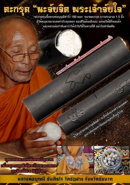 หลวงพ่อลงยันต์นะเมตตาบนแผ่นตะกั่ว ประสานใจกัน หนุนนำส่งให้ผู้ใช้ตะกรุดนี้มีผลแทบทุกอย่างตามที่อธิฐานจิตและ ตั้งใจบอกตะกรุด วิธีใช้ : ให้กำตะกรุดให้แน่น ว่า นะโม 3 จบ กลั่นใจว่าคาถา นะเมตตา โมกรุณา พุทปราณี ธายินดี ยะเอ็นดู สิทธิแก่กู สะวาหะ สะวะหายะ นึกถึงจิตคนที่เราจะเรียกให้เขารักเมตตาเราแล้ว กลืนน้ำลายลงคอ 1 ครั้ง ตอนกลืนให้กำหนดว่ากลืนจิตคนคนนั้นเข้าไปด้วย ทำเหมือนกับตอนที่หลวงพ่อลงสาลิกาลิ้นทองให้ พอลงเสร็จหลวงพ่อจะให้กลืนน้ำลาย หรือจะพกตะกรุดติดตัวอย่างเดียวก็ได้ ผู้ใดบูชาผกตะกรุดติดตัว จะมีพลังแห่งความเมตตา มหาเสน่ห์มหานิยมแก่ผู้คนที่อยู่ใกลเรา เลิกรักเรามิได้นี้เป็นอุปเท่ห์การใช้ตะกรุดตะกรุดนะจับจิต พระเจ้าจับใจ *ตะกรุดรุ่นนี้หลวงพ่อบุญมีทำไว้ 180 ดอก ขนาดตะกรุด ยาวประมาณ 1.5 นิ้ว มีโค๊ดและหมายเลขกำกับทุกดอก...ของดีไม่ต้องมีเยอะ.....แต่ขอให้มีก็พอแล้ว.... และหลวงพ่อกำชับมาว่าให้นำไปใช้ในทางที่ดี อย่าไปทำผิดศีล...