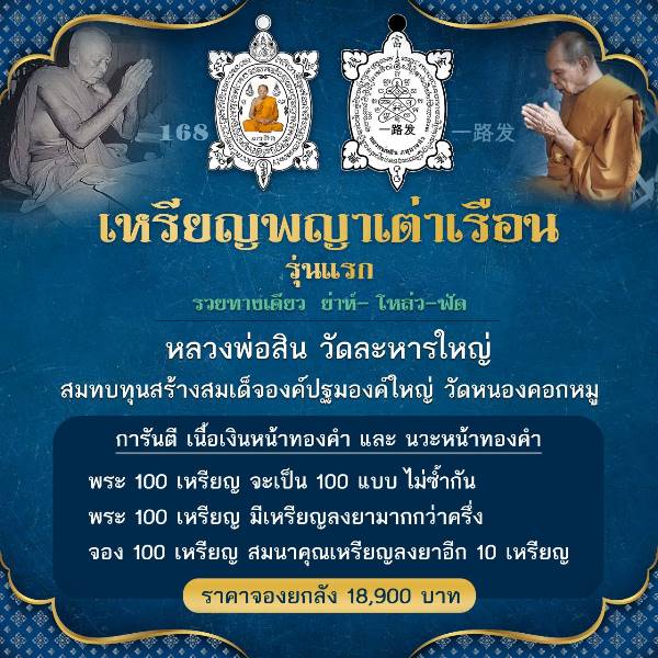 เหรียญพญาเรือนเต่ารุ่นแรก 168 รวยทางเดียว ย่าห์- โหล่ว-ฟัด หลวงพ่อสิน วัดละหารใหญ่ สมทบทุนสร้างสมเด็จองค์ปฐมองค์ใหญ่ วัดหนองคอกหมู ราคาจองยกลัง 18,900 บาท การันตี เนื้อเงินหน้าทองคำ และ นวะหน้าทองคำ