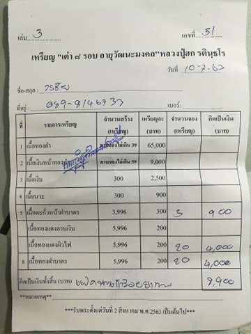 - รายการ 5 เนื้อตะกั่วหน้าฝาบาตร ราคา 700 บาท มียอด = 3 องค์