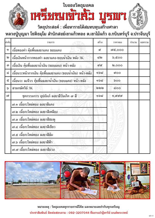 รายการ 1.เนื้อทองคำ คุ้ยพื้นลงยาแดง ขอบแดง ราคาจอง 75,000.-บาท มียอด= สอบถาม