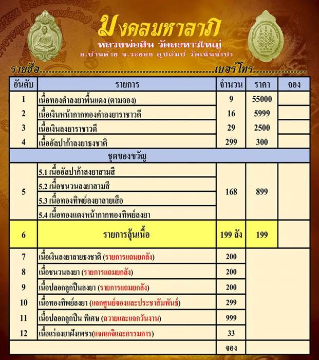 รายการ 6.ลุ้นเนื้อ (ลงยาทุกรายการ) ราคาจอง 199.-บาท มียอด= 200