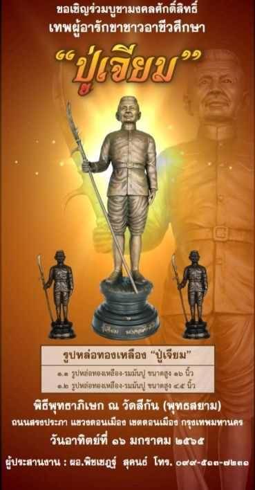 โดยสามารถจองร่วมทำบุญได้ที่ ผู้ประสานงาน ผอ.พิชเชฎฐ์ สุคนธ์ โทร.099-513-7231 พิธีพุทธาภิเษก ปู่เจียม มงคลศักดิ์สิทธิ์ วันอาทิตย์ที่ 16 มกราคม 2565 ณ วัดสีกัน (พุทธสยาม)