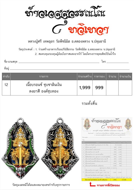 รายการ 12.เนื้อบรอนซ์ ชุบซาตินเงิน ลงยาสี องค์ชุบทอง ราคาจอง 999.-บาท มียอด= 20