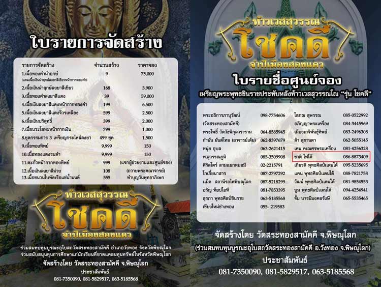 จัดสร้างโดย วัดสระทองสามัคคี อำเภอวังทอง จังหวัดพิษณุโลก
