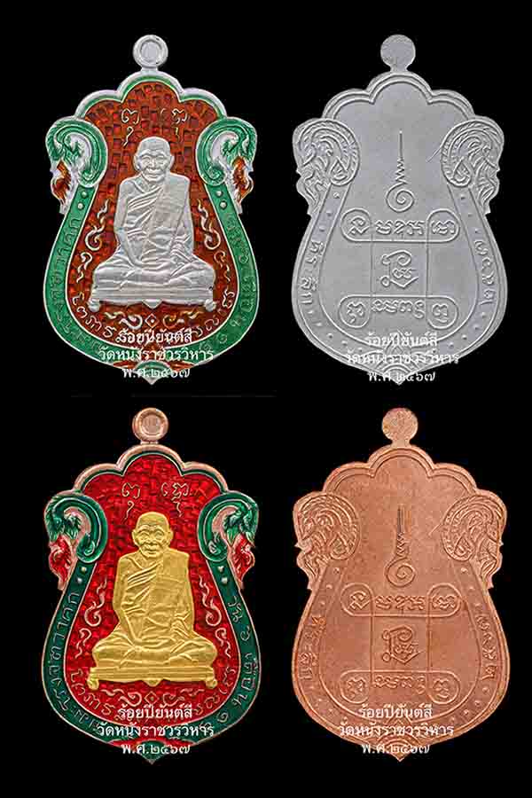 1.เงินลงยาสองสี ดุนยกหน้าเงิน ไม่ฉลุปีก มียอด 2 เหรียญๆ ละ 4,500.-
