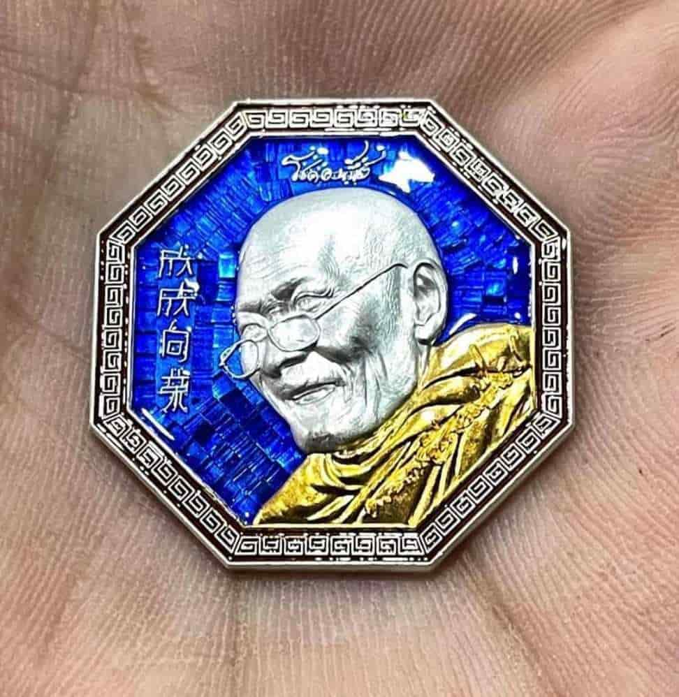เนื้อเเร่กายสิทธิ์ เงินลงยาสีนํ้าเงิน ลายเซ็นทองคํา ( ลุ้นจีวรทอง) 1 เหรียญ