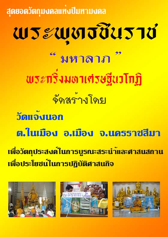 จัดสร้างโดย วัดแจ้งนอก อำเภอเมือง จังหวัดนครราชสีมา (บูชาและสั่งจองได้ที่วัด) นับตั้งแต่ปี พ.ศ. 2512 กว่า 40 ปีที่ผ่านมา หลังจากที่ได้มีการจัดสร้างวัตถุมงคลพระพุทธชินราชรุ่นแรกจนถึงวันนี้ เนื่องจากทางวัดยังขาดปัจจัยอีกจำนวนมากในการจัดสร้างและบูรณะศาสนสถานสระ น้ำภายในวัด ให้อยู่ในสภาพที่สวยงาม และเพื่อใช้ประโยชน์ของญาติโยมในกิจการงานทางศาสนา และพักผ่อนหย่อนใจ ทางวัด โดยเจ้าอาวาสวัดแจ้งนอก พระครูรัตนญาณวิสุทธิ์ (หลวงพ่อนิยม กมโล) จึงได้จัดสร้างวัตถุมงคล พระพุทธชินราช ขึ้นมาอีกครั้งโดยเรียกว่ารุ่นมหาลาภและในการจัดสร้างวัตถุมงคลชุดนี้ยังมี การสร้างพระกริ่งมหาเศรษฐีนวโกฎ ซึ่งถือว่าเป็นพระเก้าหน้า ประทานโชคลาภ มหาบารมี ความร่ำรวยมั่งคั่ง และความสำเร็จทุกประการ และตะกรุดอีกจำนวนหนึ่งด้วย