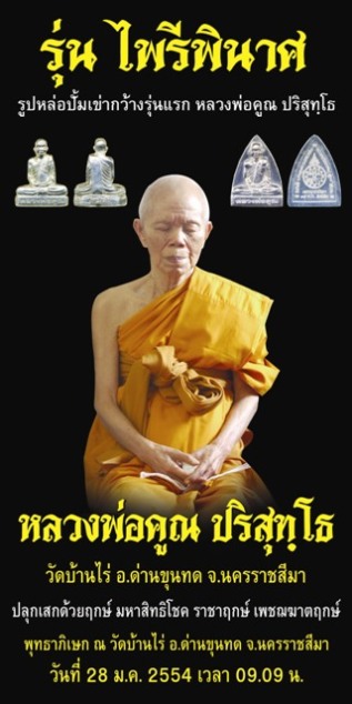 กำหนดฤกษ์วันที่จะประกอบพิธีพุทธาภิเสกวัตถุมงคล รูปหล่อปั้มเข่ากล้างรุ่นแรก หลวงพ่อคูณ รุ่ไพรีพินาศ ณ วัดบ้านไร่ อำเภอด่านขุนทด จังหวัดนครราชสมา โดยความเมตตาของ หลวงพ่อคูณ ปริทสุทโธ นั่งปรกอธิฐานจิตเป็นกรณีพิเศษ จึงถือเอาวันที่มีฤกษ์ เพชฌฆาตฤกษ์ เป็นวันประกอบพิธีพุทธษภิเสกวัตถุมงคล