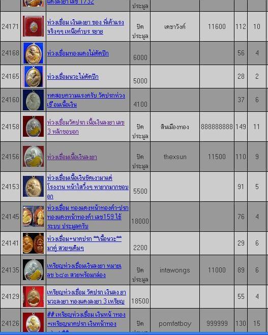 ห่วงเชื่อมวัดปรกแรงจริงๆโดยเฉพาะเนื้อเงินลงยากับจำนวนที่สร้างน้อยแค่ 1,188 เหรียญ ถ้าไม่ได้เข้าเว็ปสักวันตกขบวนแน่นอน เมื่อวาน (20/7/54)ขึ้นหมื่น วันนี้หมื่นกว่า คาดว่าราคาอาทิตย์หน้าช่วงสิ้นเดือน ราคาน่าจะแซงเหรียญเจริญพรบนทองแดงแน่นอน เนื้ออื่นราคาก็ขยับตามเช่นกัน  |