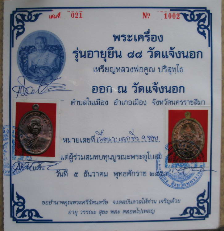 ได้มีโอกาสไปเที่ยวโคราช จึงนำเหรียญแจก อายุยืนครึ่งองค์ ไปขอออกบัตรที่วัดแจ้งนอก ออกบัตรโดยพระสงฆ์(เข้าใจว่าเป็นพระเลขา)