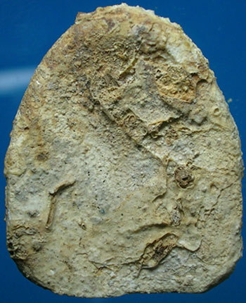 พระสังกัจจายน์ในภาพดูง่ายเต็มไปด้วยคราบกรุที่ขึ้นตามธรรมชาติเป็นเอกลักษณะของพระกรุวัดเงินคลอยเตยโดยเฉพาะ คือจะพบคราบแบบฟองเต้าหู้ ซึ่งดูยับยู่ยี่เป็นแผ่นๆมีทั้งเกาะแน่นสลับแทรกตัวเกาะอยู่ทั้งด้านหน้าด้านหลังแล้วด้านข้างทั่วๆไป นอกจากนั้นยังพบคราบตะกรันที่เกิดจากเศษปูน เศษเม็ดทราย เศษต่างๆที่อยู่ในเจดีย์ กระเทาะร่วงหล่นลงมาเกาะผิวพระและเกาะแน่นกับคราบกรุฟองเต้าหู้ให้พบเห็นนี้ด้วยครับ